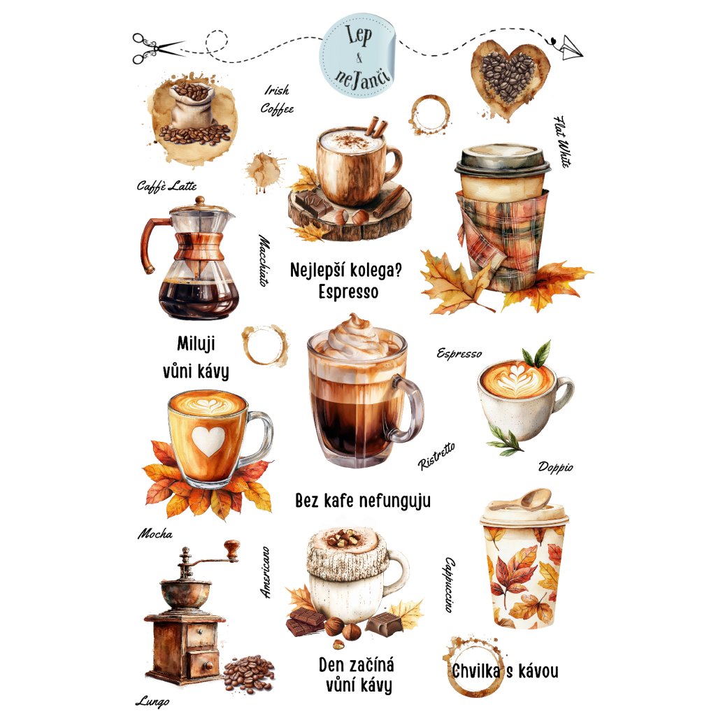 Den začíná kávou! Tento arch samolepek je určen pro všechny milovníky kávy. Najdeš tu voňavé hrníčky, kávová zrna, moka konvičku i vtipné hlášky o kávě. Skvělé pro zdobení diáře, plánovače, alb, kronik i kreativních projektů. Káva v samolepkách ti dodá energii a úsměv kdykoliv během dne.